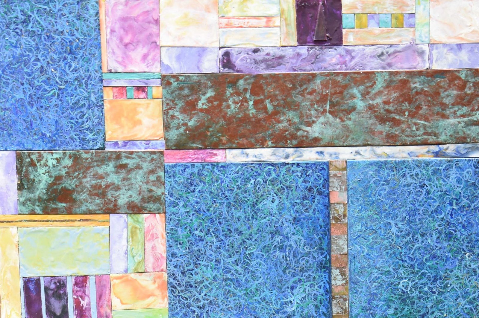 The work employs a rich and tactile combination of materials, building the composition with layers of pigmented wax encaustic and acrylic paints. A defining feature of the work is the integration of copper, which has been deliberately patinated to create its characteristic verdigris hues, and potentially bronze treated similarly.